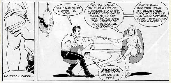 In The Elvis Presley Experience, writers Herb Shapiro and Patrick McCray very earnestly attempt to rehabilitate Elvis in the afterlife but it ends up reminding me of a Jack Chick religious tract without Jesus and with Seventies-style talk therapy. The comic starts with Elvis floating in eternity and then materializing in his heaven-issued therapist’s office to work out residual issues by recounting his life. If you’re curious about heaven I’m happy to report that Farrah Fawcett never went out of style and Jenny has hair just like one of Charlie’s Angels. Also, the dead have fabulous apartments, walk everywhere and are young and beautiful sort of like Logan’s Run without the explosions. And luckily for Elvis they fix physical and “intellectual defects” (issue 1, p. 4). Offering him a cigarette, Jenny tells him, “No one’s in very good shape when they get here, so we take the liberty of giving you… an overhaul. We’ve even boosted your intelligence.” (4).