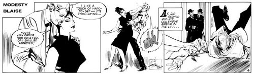Modesty Blaise started with a strip in 1963, continued in newspapers and novels until 1996 and in film from 1966 to 2003. But she is best in comics. She is, as Mike Paterson’s introduction has it, “Bond shaken, stirred, sex-changed and slugged” set in the strict discipline of the daily newspaper strip, three panels at a time. A child displaced by War World II, Blaise grew up to take over a criminal gang in Tangiers and turn it into a vast organization known as The Network, aided by her faithful friend, Willie Garvin. Blaise and Garvin retired in England, until they were recruited by the British government as covert agents, but, make no mistake, Blaise is in control. O’Donnel’s thriller narrative flows with no interference from the three panel format in Titan’s nice large collections. Holdaway’s reminds me a littel of fashion layouts even when Blaise brutally breaks a fresh American millionaire’s nose with an elbow strike.