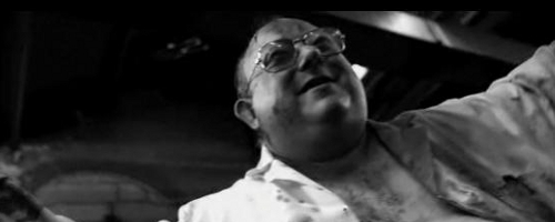 Not so in HC2, gore, by diminishing effect of repetition, the literal constant bludgeoning, forces the gore to take the backseat to the unsettling idea of violence beyond compassion. Gore happens, and, yes, there are close-ups, and it’s impressively done, but the film is in black and white. (Although he comically gives feces the same treatment Spielberg gave the little girl’s red dress in the 99% black and white film Schindler’s List)–in short, the gore is numbing. While it could have been a censorship thing, I felt that this choice was made to appeal to our imaginations–to give us the blue print of each devastated carcass, and to have us fill in the blanks with our imagination, in a way that CGI could never do. Not that it leaves much to the imagination, maybe just enough.
