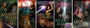 Luckily for me, I could dive right into Andrews’ backlist.  At the time, said backlist consisted of the first three novels in the ‘Kate Daniels’ series:  now there are five, plus several attendant shorter stories, with more on the way.  Kate Daniels is a swordswoman who lives in a semi-contemporary Atlanta.  ‘Semi’ because in Kate’s world, magic rises in powerful waves which knock out complicated technology while they last.  Skyscrapers crumble; phones don’t often work; cars sit idle.  The magic has also revived in the population.  There are mages, witches, shapeshifters, and necromancers galore.  As might be expected, the magic users tend to cluster together, for safety and for power.  The witches have covens; the necromancers band together as The People, and the shapeshifter Pack lives in a giant fortress outside the city limits.  The head of the Pack is an immensely powerful shape-shifting lion named Curran.