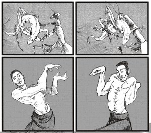 Infinite Kung Fu‘s final fight breaks action down into individual moves, but it doesn’t seem cinematic in quite the above sense. And that’s a little strange, because the book is all about a love of classic martial arts cinema. Maybe it’s that McLeod uses decompression appropriately. After all, Shaw Brothers are right there behind Infinite Kung Fu. And McLeod highlights stances and styles in a way reminiscent of pre-1980s martial arts films, combatants announcing styles or pausing between sets of movements to allow enthusiasts to recognize, say, Mantis Fist. But the action reminds me of something else, too—the diagrams demonstrating stances in kung fu manuals.