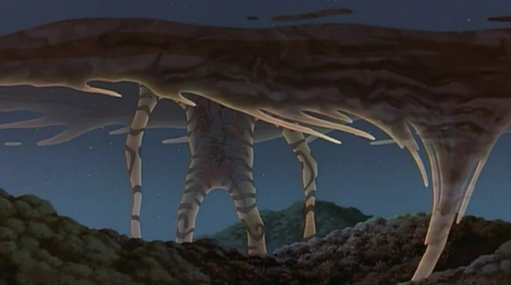 The leader of Iron Town decides that the solution to the conflict is to hunt and kill the Forest Spirit, a being that transforms into a giant Nightwalker and wanders the forest like one of the Colossi. She manages to shoot its head off, but by decapitating it, she transforms it into a god of death that destroys everything it touches in a quest to find its severed head. The metaphor here is more clearly social-environmental than in Colossus, but I think the practical conclusion to be drawn is the same: