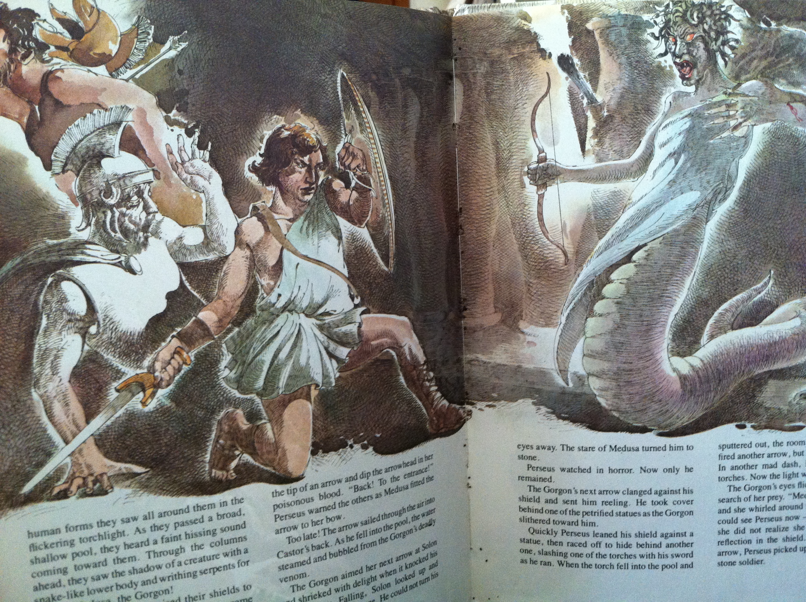 When I was too young to really remember, I was taken to this film in the theater. Because I have no real memory of that experience, I am amazed by my true first memory of Clash of the Titans (1981). It all happened because of a wonderful non-profit program called Reading is Fundamental, or Reading is Fun as we called it when I was in elementary school. Many of you know about this: kids are given a colorful little RIF catalog on toilet-paper-thin newsprint paper with a wealth of covers and titles to choose from. Their parents help to make an order, and then, weeks later, the classroom desk is stacked high with the books that kids have ordered. It was like Christmas. And one of the books I had chosen was an oversized hardcover children’s book version of Ray Harryhausen’s Clash of the Titans movie.
