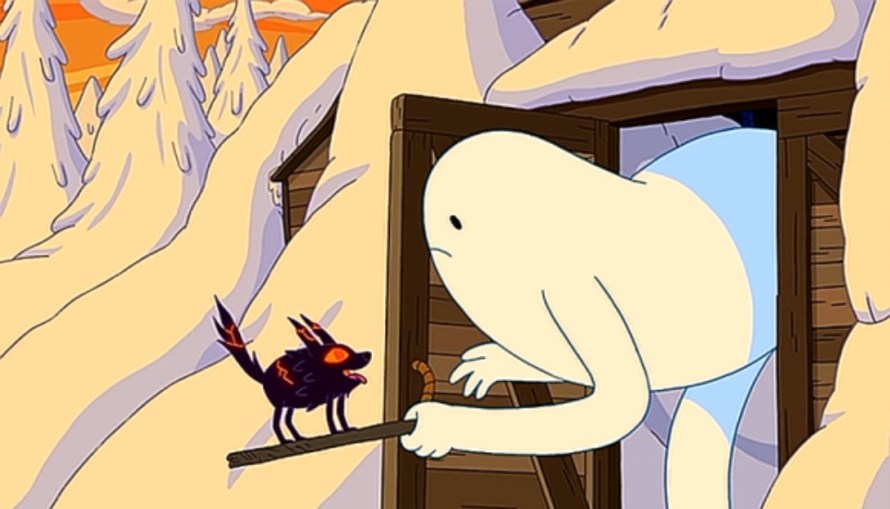 For instance, they’ll present a problem that you’d normally expect the characters would have to deal with and Finn or Jake will say, “Should we…? Nah,” or just blow a raspberry and go home to eat sandwiches. Periodically they end episodes with a new problem that the writers never have to solve, and they’ll often resolve an inconsistency between episodes with an offhand remark like ‘Remember when that thing happened? Oh, yeah, and then we had to do this other thing so it’s not like that anymore.’ Usually that would seem like lazy writing to me, but in the context of the show it seems like a clever way of avoiding boring exposition. For instance, when Finn gets obsessed with playing match-maker for magically animated miniature versions of themselves and all their friends, it creeps Jake out so much he goes to stay with his girlfriend and comes back 16 weeks later to find Finn still playing with them.