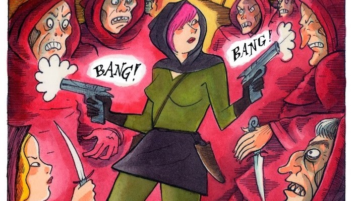 Violenzia is the titular antihero of two of the stories collected in Violenzia and Other Deadly Amusements. Violenzia was first published by ComiXology in 2013 as a digital-only comic. Now it’s available in a lovely softcover book collecting three stories, “Violenzia,” “Forgotten,” “Violenzia Returns,” and a twenty-six drawings, “Malevolent Reveries: An Alphabetical Exhibition.” Violenzia is heir to pulp heroes like the Shadow and my favorite, the Spider. Like the Shadow, Violenzia carries two guns. Like the Spider, she shoots most of her problems. On occasion, she punches them. Unlike the Spider, she only utters a single line in the first story. And, unlike the Shadow, Violenzia never laughs.