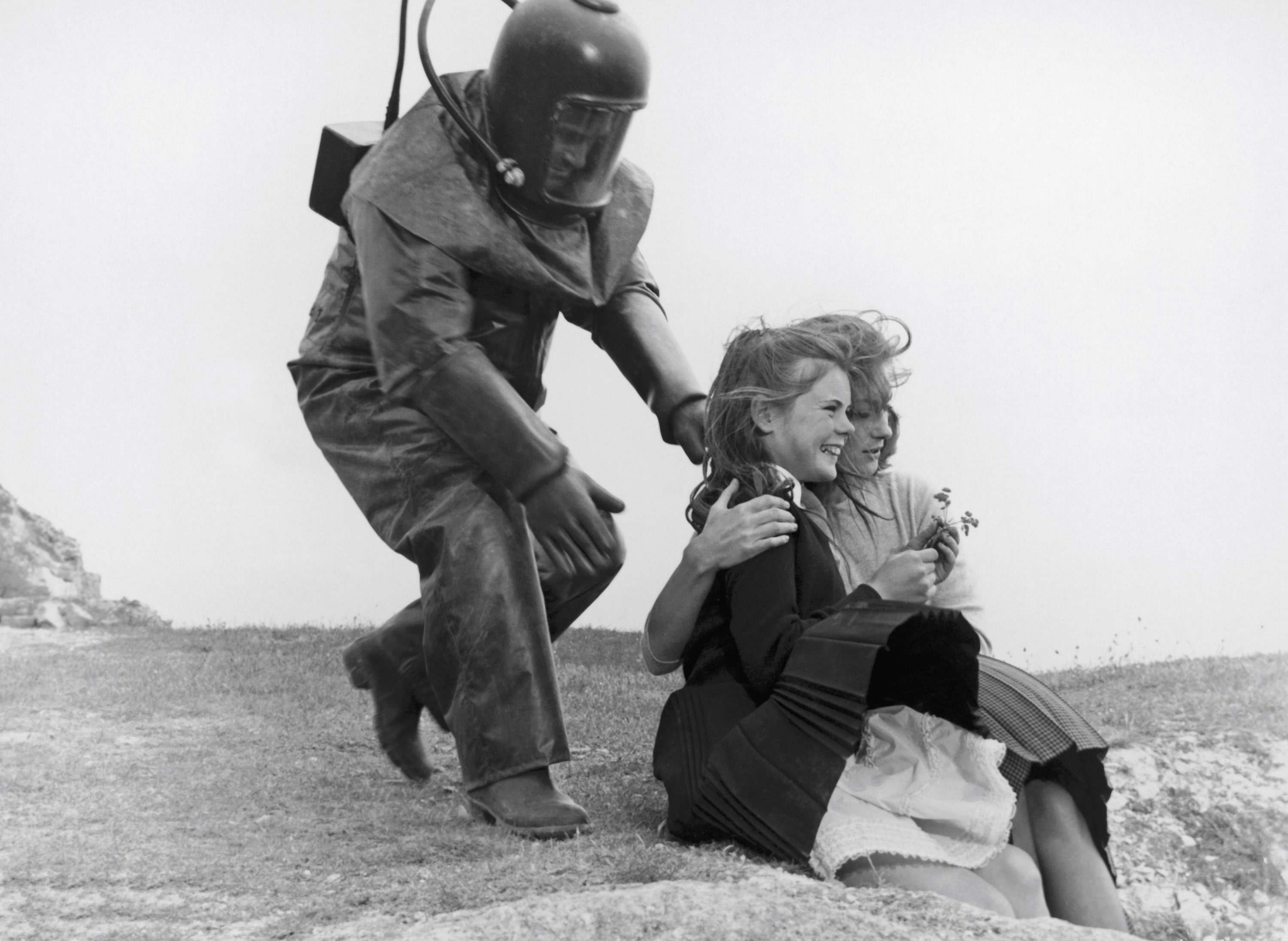 The palpable sense of horrified frustration comes to a head in a dramatic finale that ends in devastatingly bleak fashion. I always love a good juxtaposition of the quaint and expected with the futuristic, and this film’s seaside setting suddenly crawling with men in radiation suits is particularly unnerving. Freya’s macabre sculptures take on a different character, and as they are left scattered around her clifftop house it becomes chilling just how much they resemble the ghostly shadows left behind in Hiroshima after the atomic blast. In Hammer’s more famous horror films, good might have eventually triumphed over evil in the end, but in These Are the Damned, we’re afforded no such catharsis. There are no good guys, no bad guys, no solutions. The assumption of atomic annihilation inevitability looms over everything, and thus it introduces one final group of “the damned”: the entire human race, who despite fantasies to the contrary about leather jumpsuits and shoulder pads and dune buggies, has no hope whatsoever of surviving a nuclear war of the type people expected during the Cold War (incidentally, much is made about the cold body temperature of the children, them being true products of the Cold War). Black leather may smash and kill, but it’s no match for radiation suits and government men in tweed.