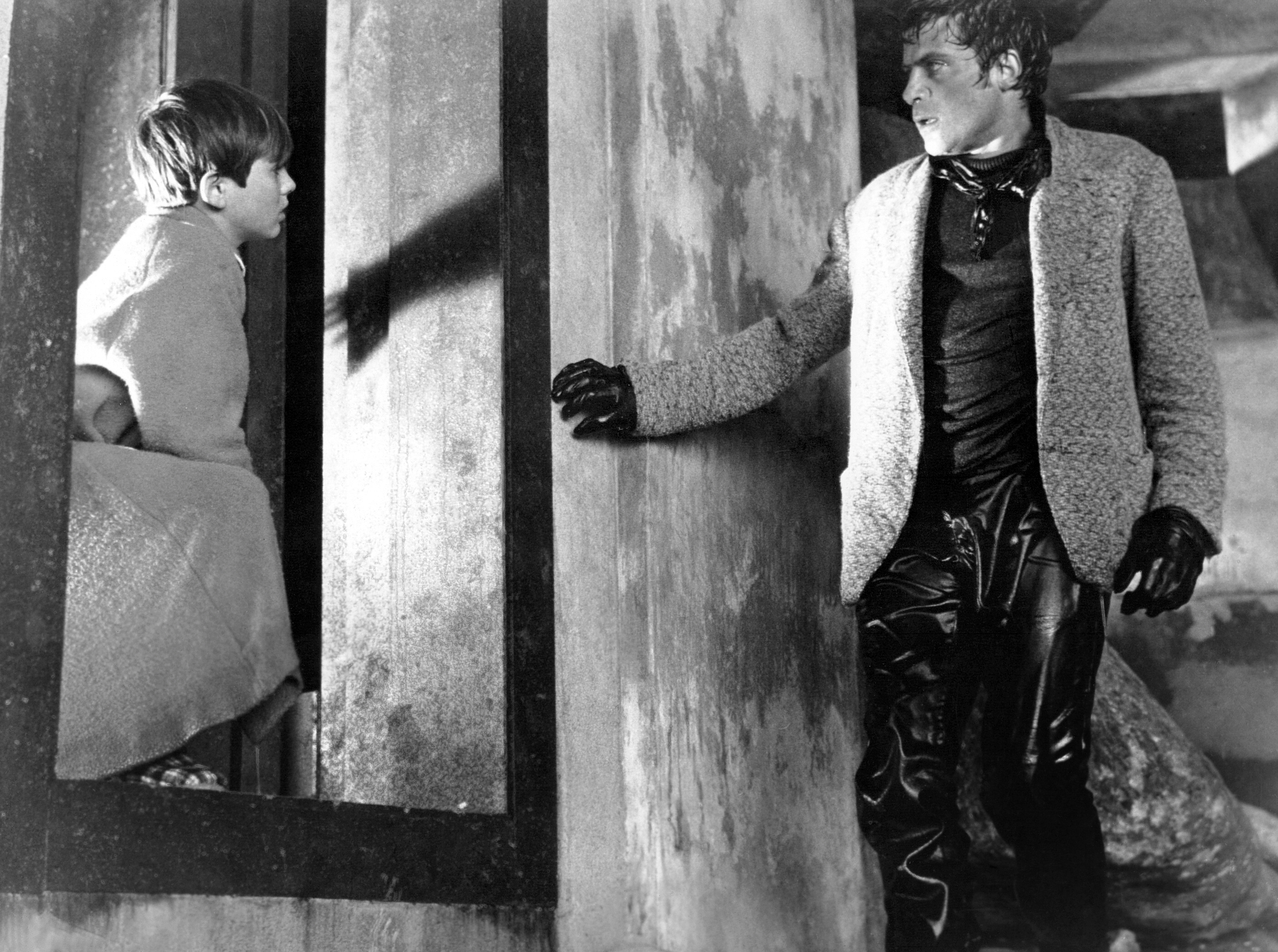 Based on the first half of the film, one could be forgiven for thinking this a juvenile delinquent film, and that “the damned” referenced in the title are the gang of directionless youths engaged in random acts of petty mischief and violence, for whom the quaint British seaside isn’t inspiring but is instead smothering. Among these activities is using Joan to lure unsuspecting, horny tourists down alleys where the gang can mug them, which is how Joan initially meets Simon. Anthony Burgess’ A Clockwork Orange had been published just a year prior, and it’s obvious that Alex and his droogs served as a model for King and his cronies. Even A Clockwork Orange‘s delinquents seem petty and childish at first, until all of a sudden we learn they’re capable of some truly nightmarish crimes. Similarly, while the teddy boys who open These Are the Damned seem to be mostly about wearing funny little hats and causing minor disturbances as the local arcade, Oliver Reed lends King an air of pent-up potential ultra-violence. It is a minor bit of shame that the gang is otherwise so ludicrous. At times like Eric Von Zipper would be a more suitable leader for their shenanigans, which consist of a lot of movie gang usuals like walking funny, aggressive crossing the street against the light, lockstep marching while whistling the movie’s theme song, and pestering women by saying “‘ere, ere’ ere, wot’s all this then? A pret’y bird? ‘ello, luv!” On top of that, there’s the film’s theme song, courtesy of a bunch of old British guys trying to write hip, young music. Mention the film to anyone who knows it, and you are guaranteed that a good many of the responses will just be people citing the lyrics to the movie’s absurd but dangerously catchy “Black Leather” theme song.