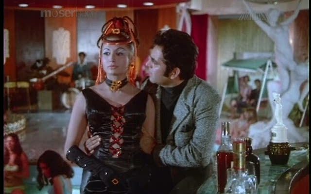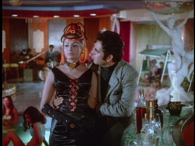 Apradh (1972) features the drunk hero imagining the woman he loves as the “item girl,” that staple of explicit dancing. There are fountains with colored lights and swimming pools full of stoned tourist extras—in Bollywood, as most other places, superfluous white people make everything worse. There are gambling tables, a revolving bar, mariachis, a stuffed tiger, and naked statues in risqué poses. Debauch-o-rama!