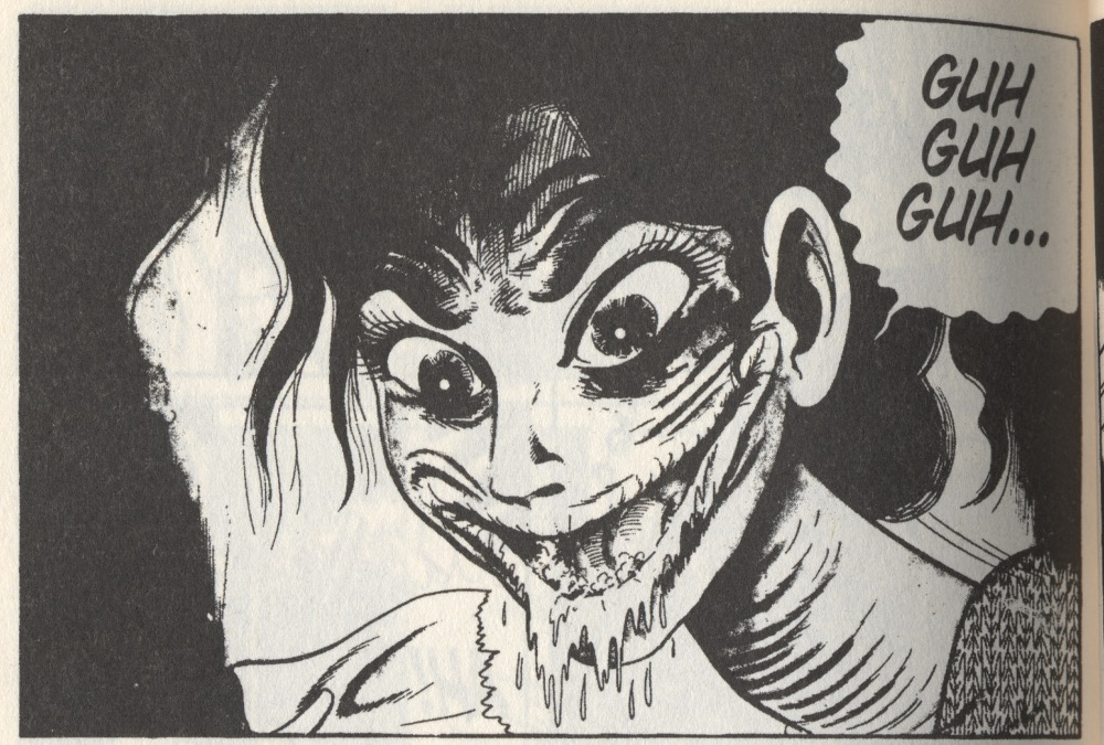“The Spotted Girl” opens again at East Sogo Hospital during a stormy night in the aftermath of “Scared of Mama.” Nurses express their disgust over the snake lady, locked in her room once again. Yumiko goes to stay with her aunt and cousins in Midoro village. But the snake lady escapes the hospital and works hard to ruin the poor girl’s life again. A local priestess has warned the townsfolk a snake is coming, and they suspect Yumiko is that very snake. Her aunt and uncle want to send her back to Tokyo, but it’s too late. And it’s way too late after Yumiko and her cousin Kyoko wander into an abandoned house, locally known as “the snake house.” The snake woman is in residence and the house is filled with spotted vipers. The girls are attacked by the snake woman, who is bitten by a viper, and the girls escape. Unfortunately, Kyoko is bitten by one of the vipers. (This is where proper signage comes in, but then again the snake lady is just the kind of person who’d take the sign down). The local doctor saves Kyoko’s life with a blood serum and the townspeople burn down the snake house. But Kyoko seems different. Her teeth seem sharper. She’s crueler. She’s transfixed by a frog. There’s something different about her expression, though it’s not as extreme as the transformations of the original snake lady. And Kyoko’s sister, Kanna, fears her and has nightmares about snakes. Until one morning, Mariko has a bandage on her neck and she’s not afraid of Kyoko at all anymore. In fact, Mariko becomes scary herself. And then a typhoon delays Yumiko’s departure and Kyoko’s family all have marks on their necks. Of the three stories, the presentation of snake monsters is most vampiric in “The Spotted Girl.”
