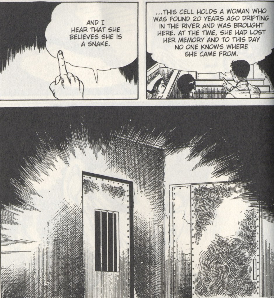 And her transformation is not through her bite, but by feeding children her scales, whether in water or in school lunches. Satsuki sees what happens to Yoko and Satsuki pursues, in an amazing series of panels by Umezu. He captures the snake woman’s motion beautifully. Failing to catch Satsuki, the snake monster sends Yoko to transform her friend by putting snake scales in her lunch for school. Satsuki almost succumbs but is rescued by her father, and, strangely enough, by Yoko, who attacks her mother. A heavy rain washes the snakes away, but Satsuki hopes Yoko survives. And perhaps she does, since we end “Reptilia” in East Sogo Hospital, in a barred room containing a woman who believes she is a snake, and suffers from a “paranormal illness,” which makes her body transform because of her belief.