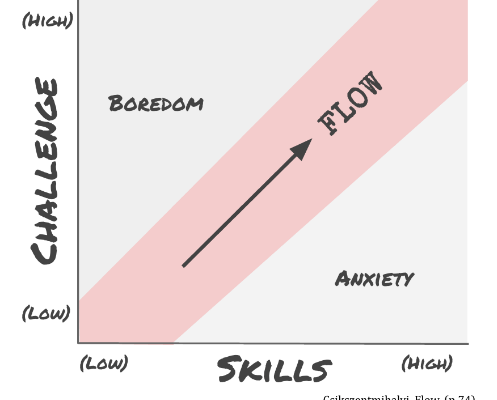 The theory of flow is that there’s a relative point between skill and challenge where a person’s abilities and the level of difficulty of a task are aligned to make it the perfect balance of rewarding and challenging. Conversely, an imbalance between skill and challenge produces some flavor of either anxiety or boredom. Csikszentmihalyi lists both sports and video games as examples of activities that are often linked to flow states, and the pre-conditions that he suggests for flow have actually been applied to video game design. He says that activities that are likely to lead to flow states: