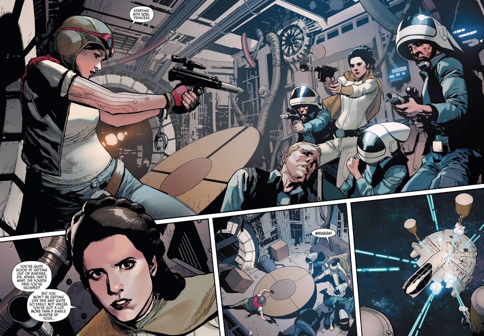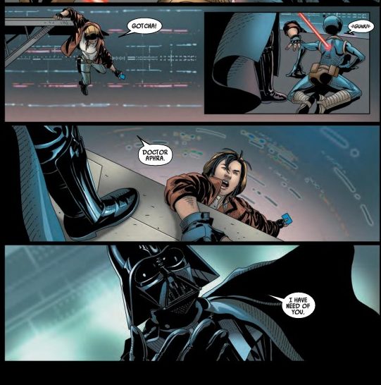 Aphra is a “horrible person,” but when compared with Vader she doesn’t seem that bad. She’s appalled and confounded by the murderousness that so often seems to be around her. It’s a clever trick, juxtaposing her with the worst people. In comparison, Aphra seems like she might be salvageable. She might be. And Gillen makes us feel for her. At the same time, she is not wrong that she is a “horrible person,” but it’s hard to believe her when she is around people who are much worse.***