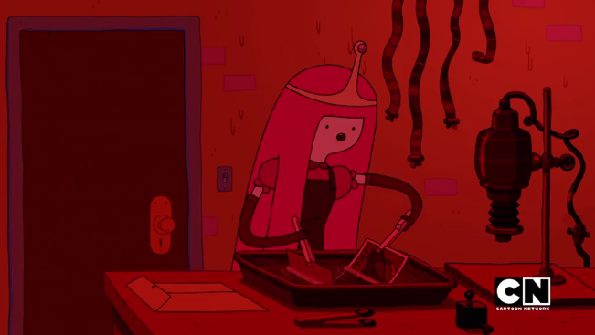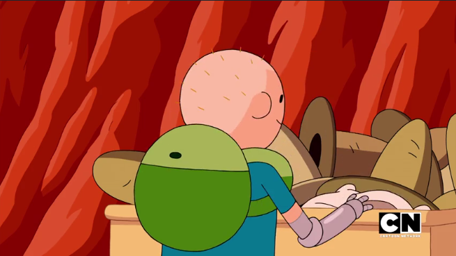 The show reflects change in smaller, far more cheerful ways, too. Say in Princess Bubblegum and Marceline’s changing fashions. Both have a wardrobe. They wear their hair in different styles. Old outfits return or are mixed and matched***. For his part, Finn has worn the same outfit for the entire series, but because he has done a lot of adventuring and growing, he must have gotten new blue shorts, t-shirts and bear hats. His changing tastes and the predations of time are revealed in his changing swords, his changing arm and the length of his hair under his bear hat.