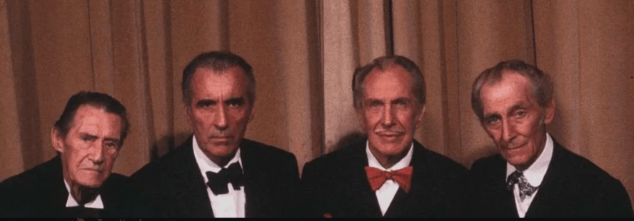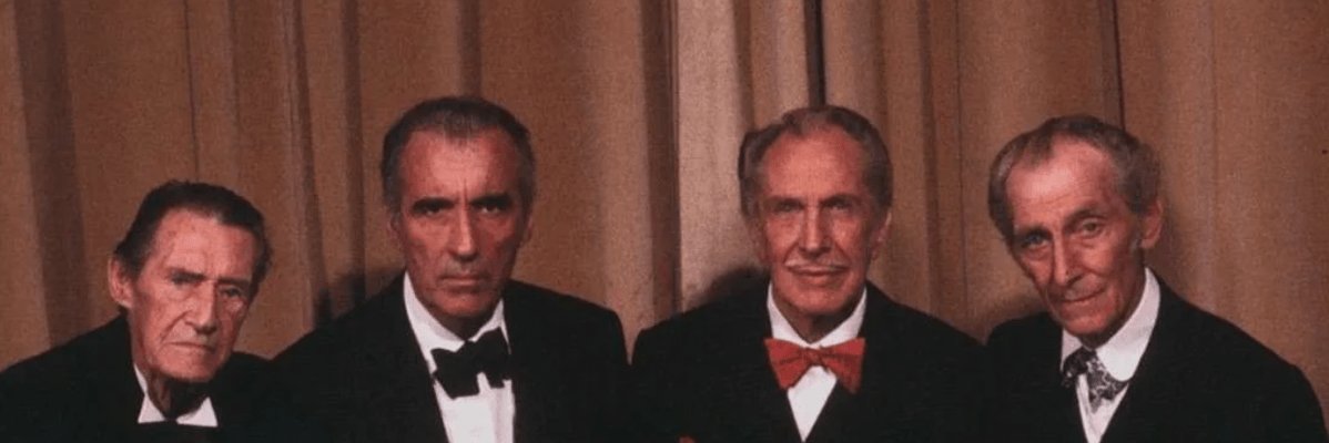 I’m not one for star signs, but some alignments are too perfect to be overlooked even by a skeptic; and so we celebrate May 26 and 27 as the shared birthday of a very special trio of actors: Christopher Lee, Vincent Price, and Peter Cushing. Masters of their craft, living legends in their time, reliably the best thing in your favorite horror films. And of course, one of the delights of loving them is knowing how much they all loved and admired each other, too. “My three best friends,” Sir Christopher captioned a picture in his autobiography, Lord of Misrule, showing him beaming alongside Price, Cushing, and John Carradine. The youngest of the four, he would also be extraordinarily long-lived and take many opportunities to informally eulogize the others in interviews and his own charming YouTube remembrances decades after their passing, vlogs by the fireside with a man that at times seemed the last of his kind. They were a League of Extraordinary Gentlemen, including, of course, such contemporaries as Lon Chaney Jr., Peter Lorre, Boris Karloff, and Basil Rathbone,* and though Sir Christopher might well have been the last of their kind, their legacy is undying stuff.