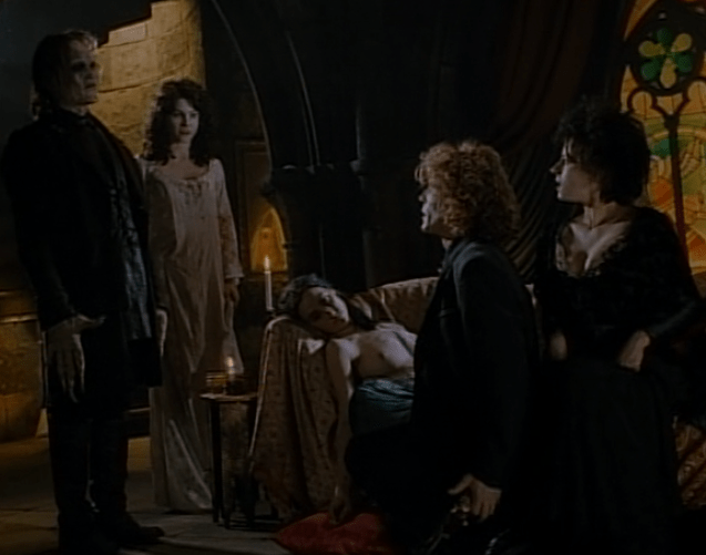 Sometimes I think the Subspecies of the series title really describes Radu, rather than his little clay Resurrection Men. Radu is a half-breed, conceived through a witch’s curse, born to be powerful, raised to be cruel. Rejected by his pacific father, he lives in the shadows of shadows, equal parts Count Orlok and Robert Smith. Unlike brother Stefan, who is the very model of a modern vampiric hero, he embraces all the aspects of vampirism that more evolved vampires write florid journal entries about, before succumbing to the same behaviors anyway. Radu is everything a vampire like Louis or Angel or Vampire Bill or Edward or his own brother hates about himself. What makes Radu different though isn’t just his lust for undeath, but that he is unwanted. He is the Subspecies, not just because of what he does, as his father or Stefan would have it, but what it looks like when he does it. I think it’s important to look at Radu teasing the hem of Becky’s nightgown up so he can feast on the femoral artery just south of her panty line and appreciate its monstrousness, unrelieved by a corruption of consent. I think it’s important to notice how little the heroes of a lot of supernatural romances have evolved beyond Radu’s stalking and panty-peeking. I think it’s important to confront how that makes us feel. Because if the main thing that makes Radu different is his looks, then it might be our own undead, necrotic attitudes that we need to put back in the grave.