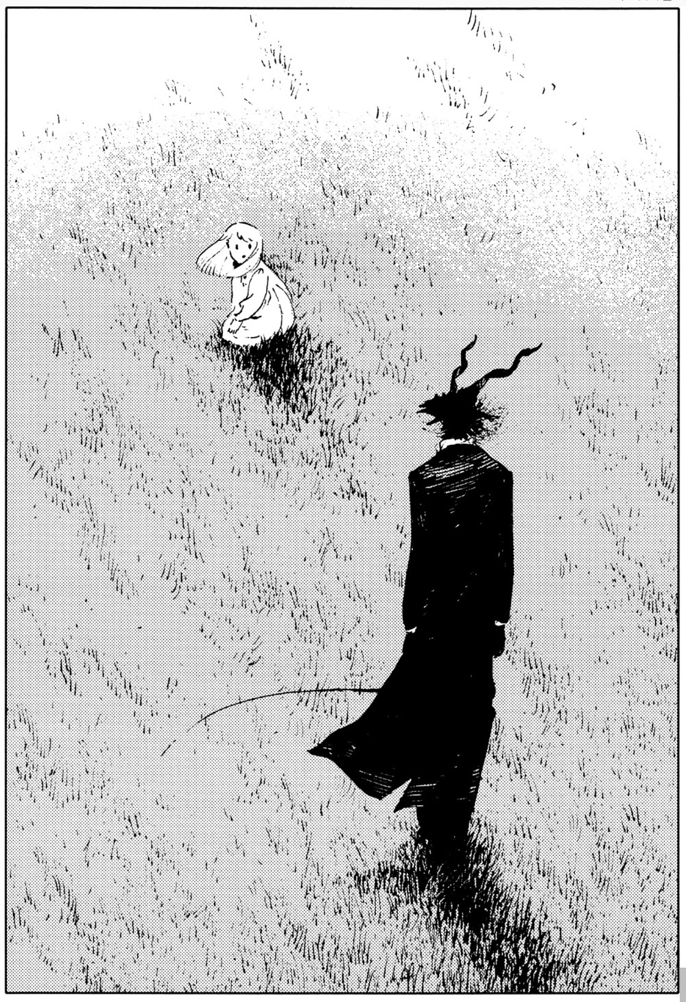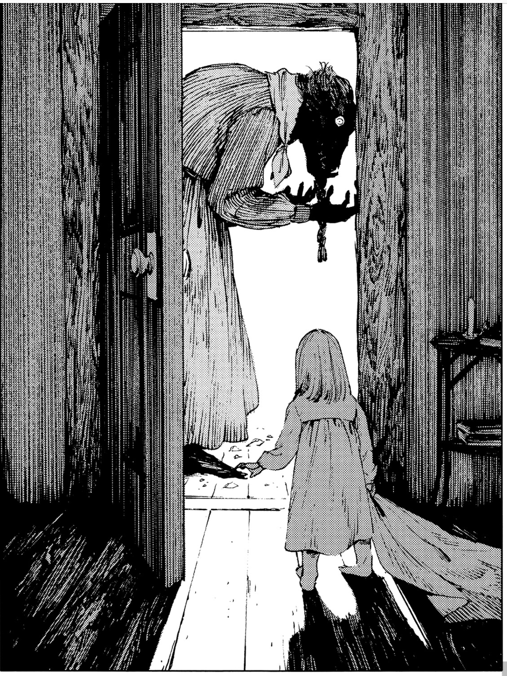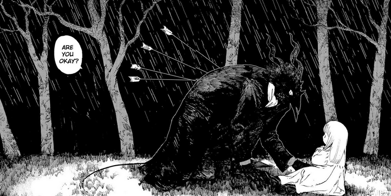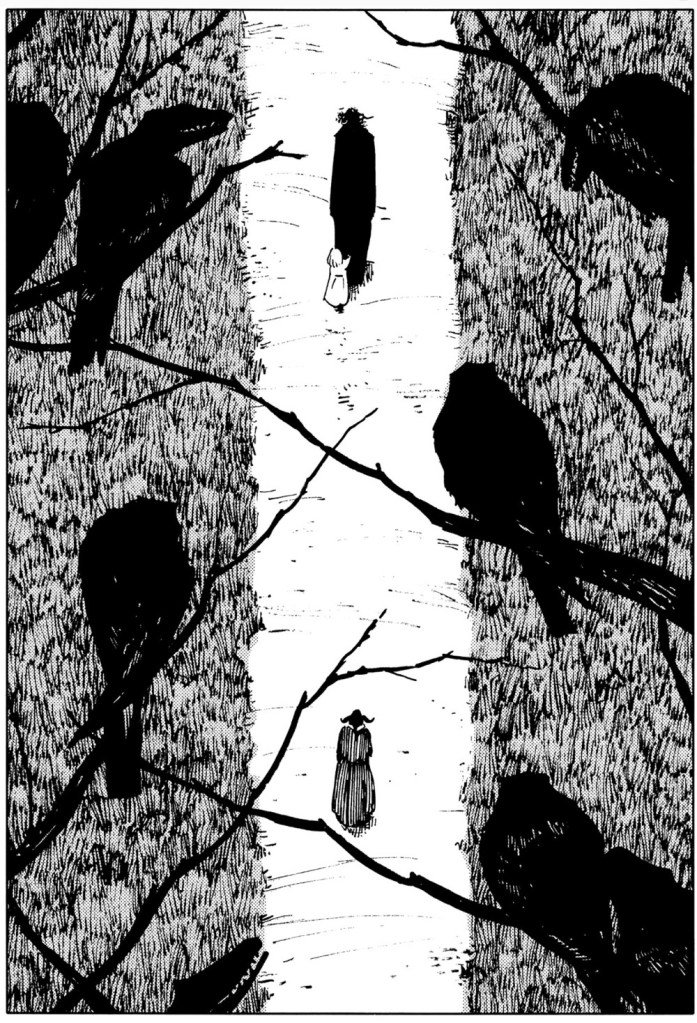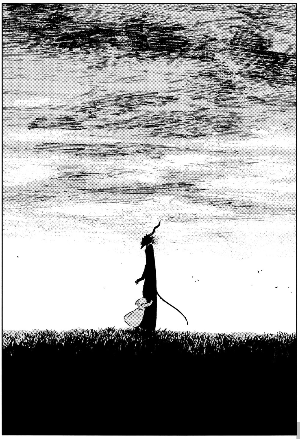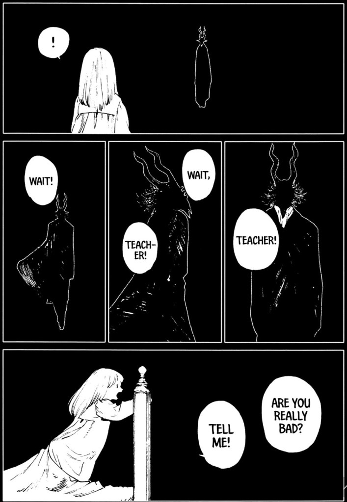 Nagabe’s use of black and white subverts their traditional use in fairy tales–and far beyond fairy tales. Shiva is as white a as a character can be while still elegantly depicting a person with hair, facial features and clothing. Similarly, Teacher is rendered almost as a shadow, with as much black as can be used while still elegantly depicting a person with black fur, horns, coat, and trousers. He is a very refined devilish-looking person.