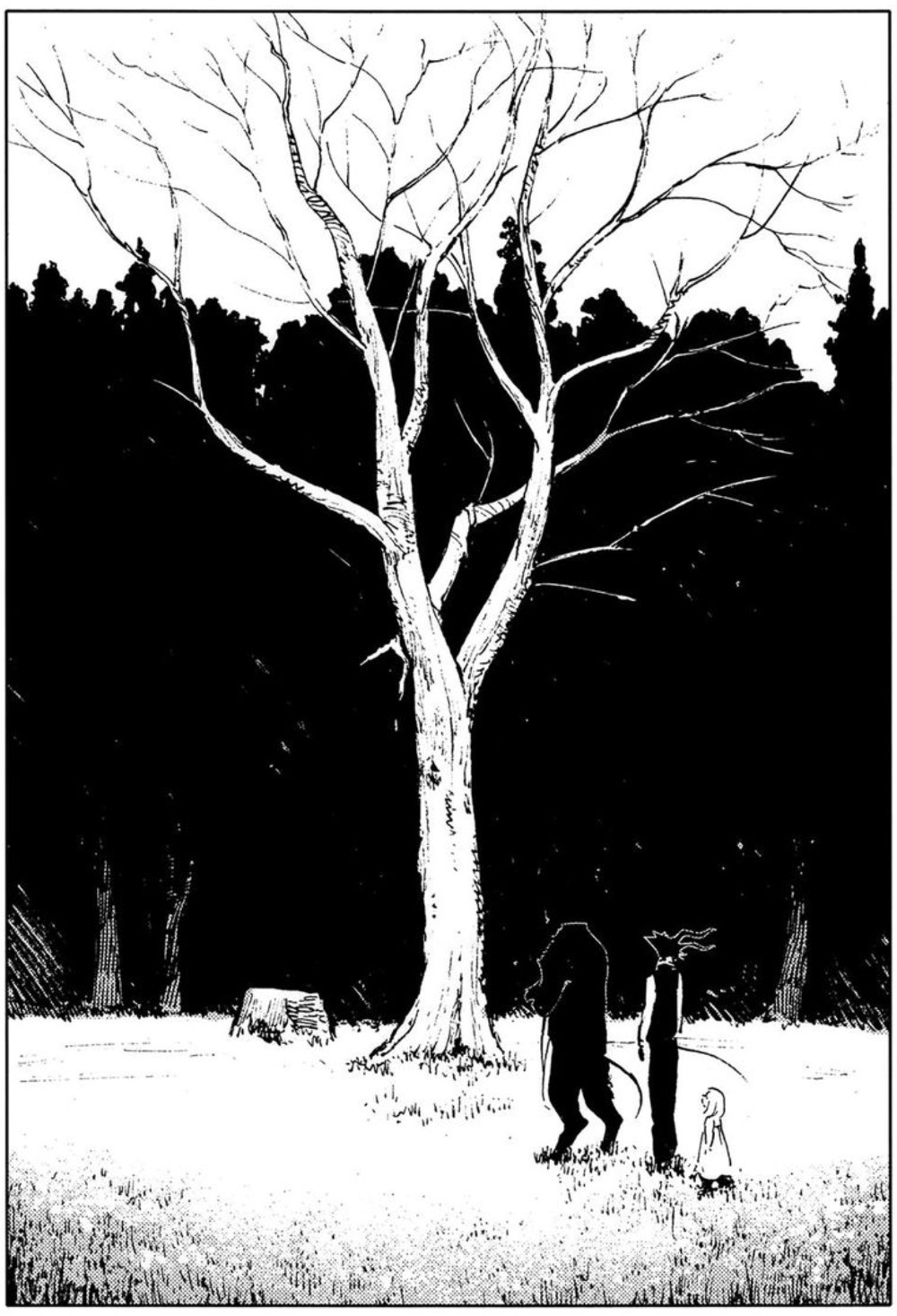 Nagabe uses but doesn’t reinforce the associations of these colors—white with purity, innocence, good. Black with corruption, wickedness and corruption. As the story progresses, Nagabe subverts these associations more and more. Shiva never becomes evil, but the humans in their white world become more and more frightening and genocidal. And the Outsiders become more comprehensible and less frightening. Though the story is very much told in black and white, The Girl From The Outside stays in-between, in the liminal space where the worlds bleed together, where we can meet people different from us, who might not be people as we understand “people” and to whom we might not be “people” at first, and where we can even learn to care for them and love them.