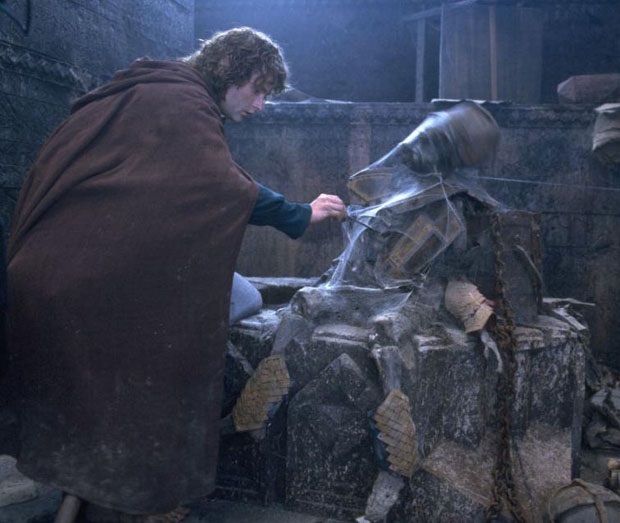 The characters, and in particular the hobbits, are often heading in one direction doing one thing and are unexpectedly picked up and swept off in another (sometimes literally) by something else, like orcs, or walking trees, or wizards. In my head I see it all fitting together like a candle burning a rope that releases a tire which rolls down a ramp and lands on a board, flinging a potted begonia through the air and frightening the cat, which flees through the cat door and triggers some other bizarre series of events ending in me getting to eat a piece of pie. In short, I love it when I can see how all of the pieces of a story are designed to work together in clever ways even if they appear at first glance to be insignificant or unrelated.