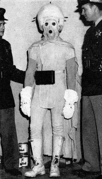 The sightings of little blue men in Elkton, Michigan happened in 1958 and was a local practical joke that somehow picked up national media attention. There were stories going around about flying saucers, and three young men with some extra time on their hands came up with the idea of dressing up as an alien and surprising people at night. The costume was made of long underwear, a bed sheet with eye-holes and a button mouth, and a football helmet with blinking lights powered by a battery pack, all spray painted a glowing shade of blue. The guy playing the alien would hop out of the trunk of their car when someone got close, run along the ditch for a stretch, then jump back in the trunk and wait to see what people in town had to say about the little blue men. The sheriff caught them eventually and they were told to “take your underwear and go home.” The local paper ran a story on the prank, which spread to the point where they got calls from TV stations across the country and even got a mention in the May 1958 issue of Life Magazine.