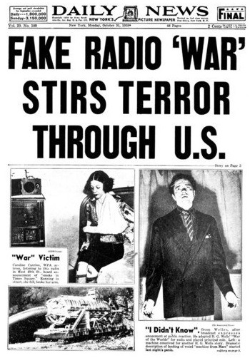 First off, the story goes that when The War of the Worlds was broadcast on CBS radio on October 30, 1938, complete with fake US army reports about Martians landing in Grover’s Mill, New Jersey, mass panic ensued, with people having nervous breakdowns and fleeing New York in droves. The story was enthusiastically taken up by media at the time and has been passed down ever since, but unfortunately it doesn’t hold up under investigation. A telephone poll coincidentally being conducted that night showed that only about 2% of people were listening, with most people tuned in to a very popular variety show on NBC instead. First person accounts from the time describe the streets of New York as nearly deserted that night, and hospitals had no records of anyone admitted with conditions related to the terror of alien invasion. Apparently there was an increase in the number of calls to the New Jersey police, some of which were to complain that fake realistic shows shouldn’t be allowed on the air, and a small group of Grover’s Mill citizens attacked the water tower with buckshot believing it had been taken over by Martians.