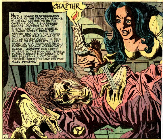 In “Death at Castle Dunbar,” Mike Hollis investigates the apparent drowning death of her sister Valerie in a haunted cove near gloomsome Castle Dunbar. Her sister had married Sir Alec Dunbar, Laird of Castle Dunbar, but shortly thereafter had died. Mike disguises herself as a writer researching the military history of Clan Dunbar, but in reality, at night, she is researching the death of her sister. Often she does this work while wearing a translucent negligeé, but she also does important work while wearing her robe. There is a scowling Scot named Dougal who takes long strides and has a wolfish dog always at his side. And, of course, Mike falls for him, despite her fear that perhaps Dougal murdered his sister so that he could gain control of the Dunbar estate. Mike is also attracted to the laird, despite his hot temper and the fact that he’s pursuing her so soon after the death of her sister. Late at night, Michelle sees what appears to be her sister’s ghost in a wedding gown. Michelle finally discovers the truth when she follows the apparition through secret passages in the castle. This story was penciled by Mike Sekowsky, inked by Dick Giordano, scripted by Michael Fleisher and plotted by Lynn Marron who has gone on to write a lot of things.