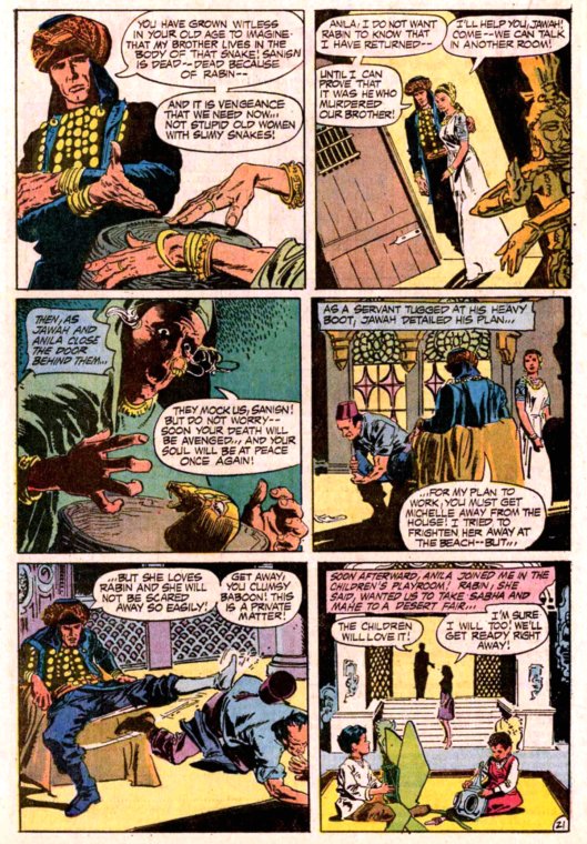 Mary DeZuñiga, Mike Fleisher and Tony DeZuñiga’s “Kiss of the Serpent” concerns another woman who decides to travel after the death of her father. Michelle Harlinson, modern 1970s working woman, goes to Bombay with her uncle after the death of her father. When the firm she is working for goes under, Michelle takes a job tutoring the children of Mr. Singh, an Orientalist fantasy of a man, who moves with “animal-like grace.” Like Blair McIntyre before him, he is alternately tender and a jackhole. Is it his temperament or does Mr. Singh have a resentful twin brother he did not bother to tell Michelle about? That’s right, he has a twin brother! It is an extremely Orientalist story, but Tony DeZuñiga had a nice time drawing reference art. It reminds me of Mike Mignola’s use of photorealistic renderings of statues and architecture in his own work for Hellboy.