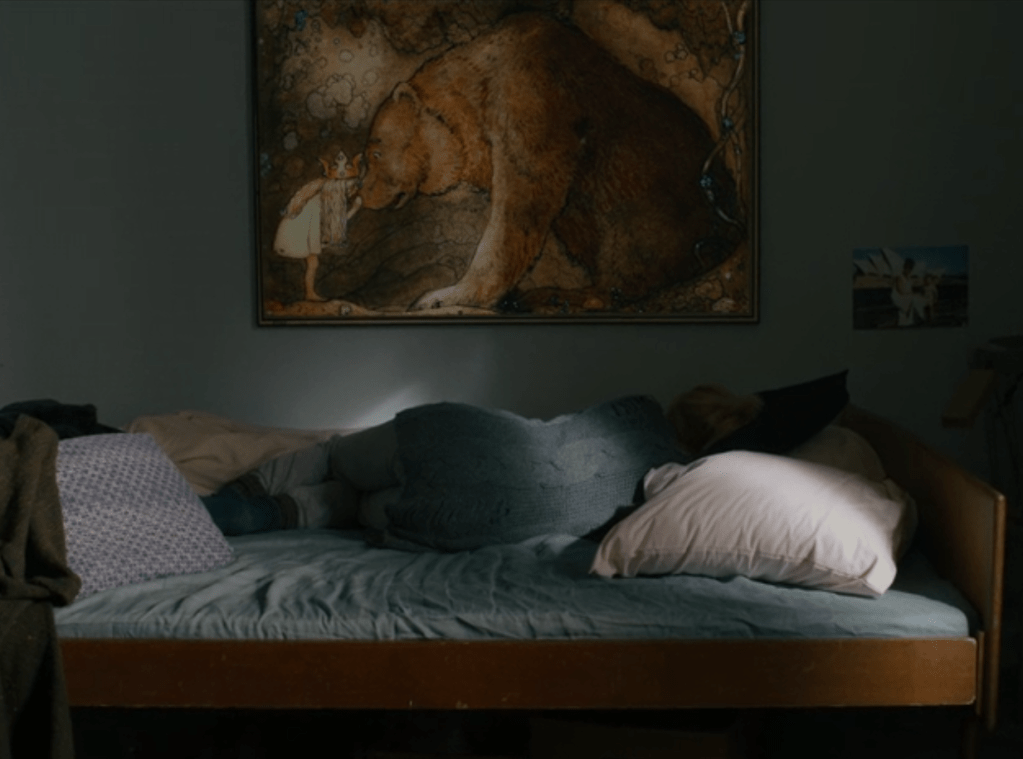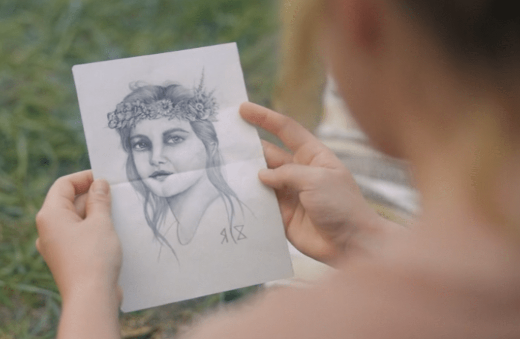 That brings me to the fatalist philosophy that prevails with the cults in the end. Art is destiny in both of the homecoming arcs that terminate Aster’s worlds, where foreshadowing is its own department at Bed, Bath, and Beyond. Dani’s wall art knows just like Christian and Mark’s apartment bric a brac knows just like Annie’s miniatures and Charlie’s crude Paimon altar know what is going to happen. They are what is going to happen. Midsommar begins with a tapestry that depicts all the major plot points of the movie. Hereditary begins by touring the fabulous, intricate miniature house in Annie’s studio, eventually gliding into a seamless transition of her artwork into her son Peter’s real bedroom. It’s an upfront signal that the Grahams are never any more in charge of their lives than Annie’s models of their lives are, and the film is bookended with a shot that pulls back on the newly incarnate Paimon and his worshipers as though they, too, are models. And Hereditary might not have Midsommar’s spoiler tapestry, but Joan’s apartment does have its own diorama that parallels exactly what the ending scene will be. Similarly, we see the structure where all the younger Hårga sleep is covered with renderings of spells, rites, and prophecies,**** prompting Christian to admire, “It’s like living Scripture.” And then he beds down under a painting of the very same fertility ritual that will be his undoing. When Pelle is talking Dani out of fleeing later, you see crowns on the wall over each of their heads, prefiguring their crowns in the final scene. And Charlie and Pelle are constantly sketching what they see, but what they see is not always present-tense. Pelle marks his first sketch of Dani, adorned with a flower crown she hasn’t worn yet, with runes that will later appear on the dress she wears while competing in the May Queen dance competition. The runes might be a prophecy or a spell, but their meaning at least forecasts a confrontation with, possibly an end, to her grief. When Annie is conned by Joan into performing a seance to contact Charlie, “Charlie” will magically fill her sketchbook up with images of her brother’s requisite suffering. From mysterious Latin scratched above Charlie’s bed to Dani’s smiling portrait on her dead parents’ bedside being topped by a very evocative bouquet to not one, but two Scarecrow art pieces in Christian and Mark’s apartment prefiguring Mark’s straw-stuffed fate, the plot is literally written all over the walls and the floors and the ceilings of both of these films. And while it’s always fun to crack open a few Easter eggs, particularly when woven with the gallows humor of many, many multivalent bits of dialogue, ***** the overall effect is that art and design becomes a Greek chorus onstage, its constant commentary one of inevitability.
