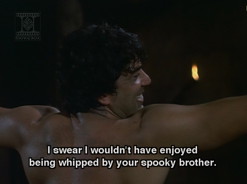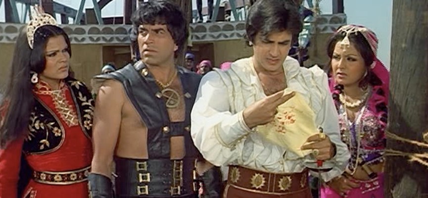 Dharam Veer is a Hindi cinema TARDIS, holding way more bedazzled boots, pirate shirts, Elizabethan doublets, Roman sandals, feisty gypsies, hand guillotines, romantic princes, creepy statues, sworn promises, lost relatives, baby-switching schemes, court politics, sword fights, naval battles, and eye-for-an-eye justice than you imagine could possibly fit inside its perfectly normal-looking DVD box—and did I mention it also travels in time?