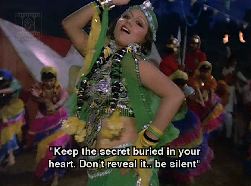 The plot hinges on a double-whammy of one of Hindi cinema’s favorite tropes: long-lost family members. Here it is multi-generational, with parents and children ripped apart, some of them having to exist with secret knowledge of true identities and others blithely unaware of truth bombs that will re-order their places in society. At the center of this complicated chart are Dharam and Veer, who are best friends (described in this song as the eighth wonder of the world) and, unbeknownst to them, royal twins. When they were born, their uncle and major villain Satval Singh threw Dharam from a tower and swapped his own son Ranjeet with Veer, so that Ranjeet would grow up to be king. In a fantastic re-switcheroo, Satval’s wife undoes his misdeed by putting the two babies back. Dharam, meanwhile, is plucked out of thin air by a falcon named Sheroo, taken to the woods, and raised by a kindly blacksmith and his wife. Dharam and Veer’s real parents are the queen Meenakshi and a hunter named Jwala, who married each other in secret in a forest and then were immediately separated by a fierce tiger, who Meennakshi thinks mauled Jwala to death the day after their marriage. Meenakshi returns to the palace and is married off to someone else immediately, so Veer is assumed to be fully royal and legitimate.
