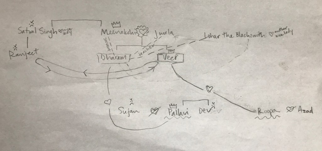 Are you confused enough to need a diagram? Great! In it, you’ll see heroines Pallavi and Roopa (each royalty of a sort in their own right) and the second generation of villains, plus a sense of the additional layer of relationships between Dharam and his birth parents.