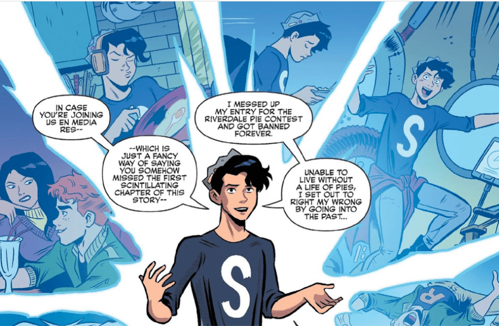Jughead Jones’ access to pies are in danger after a freak baking accident. Pies must be saved. Access to pies—and jams—must be preserved*. A wrong must be righted. When Jughead;s potentially prize-winning lemon meringue pie sickens all the judges at the annual Riverdale pie-baking contest, Jughead decides the only solution is time travel. Will Jughead save the future? Will he fix his damn pie? Will the band win one of the other contests that’s happening at the same time? Will he meet a lot of alternate Jugheads including a very Rob Liefeld one? Is this a nice little diversion with cool pictures of Jughead doing equations on a board? Is Jughead’s outfit excellent? Can Jughead’s dog Hot Dog use the microwave? Will Jughead be able to restrain himself from altering the history of the hamburger? You’ll just have to find out for yourself. But at the risk altering the future: all signs point to yes.