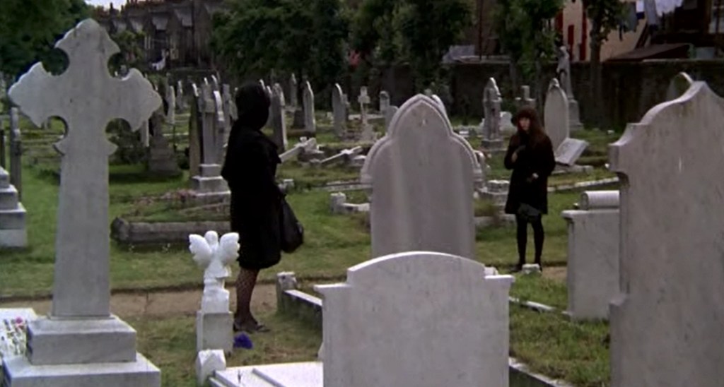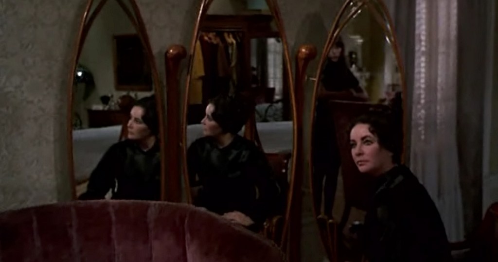 The plot follows a woman named Leonora (Elizabeth Taylor). Her day opens in a seedy hotel room, and we watch the feet of a man walking out, the door closing behind him. She prays, then goes to catch the bus. This is when Cenci (Mia Farrow) notices her, and sits too close, staring wide-eyed and fascinated. Leonora is uncomfortable, and tries to ignore her. Cenci follows Leonora through a church and into a graveyard. Leonora prays at the grave of her daughter, who drowned. The two women share a moment of painful eye contact, and the tables flip as Leonora begins to follow Cenci. Cenci leads her to the enormous mansion in which she lives completely alone after the death of her mother, who looks similar (but not strikingly similar) to Leonora.