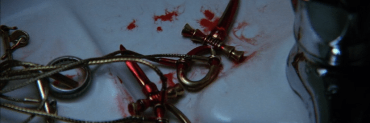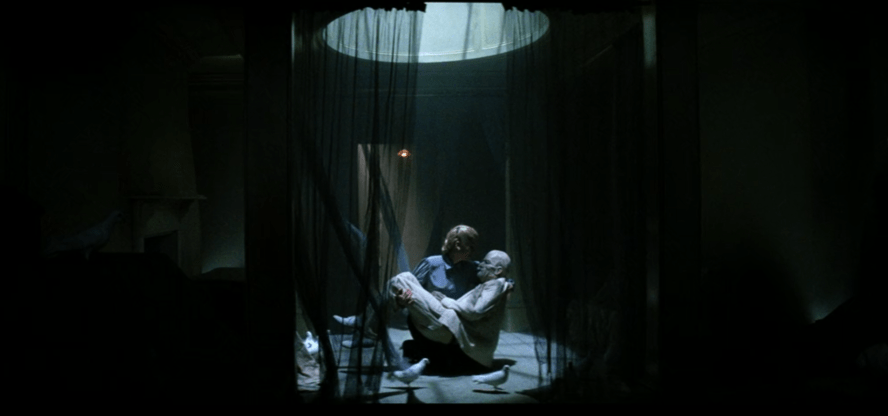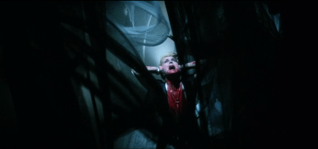 He won’t last long enough to do much about it, but the pathos of John realizing his own doom, even though he was murdering a Goth girl when we met him, makes it impossible to idealize Miriam, the film’s real vampire, particularly during her rapid, supernaturally-aided courtship of Sarah. For me, John’s story is the best part of the movie and could have easily stood on its own. Bowie’s performance is typically wonderful, and I love the way director Tony Scott intercuts John’s dawning insatiable wakefulness with a murderous rampage by a sleep-deprived monkey–a test subject in Sarah’s lab–and outtakes of Peter Murphy’s very sinuous, Bowie-y theatrical performance of “Bela Lugosi’s Dead.” It’s a not-so-subliminal rebus that makes John’s internal torment both bloody and explicit; it must be said that John confronts his onrushing doom with very English exterior composure, which makes his anger and increasingly feeble attempts to feed even more pitiable. It also convicts Miriam of monstrousness almost in absentia; the more time we spend bonding with John, suffering with John, the more we understand the stakes that would cause him to beg, too weak even to stand, not for a kiss, but for death. And even that Miriam can’t bring herself to give him.