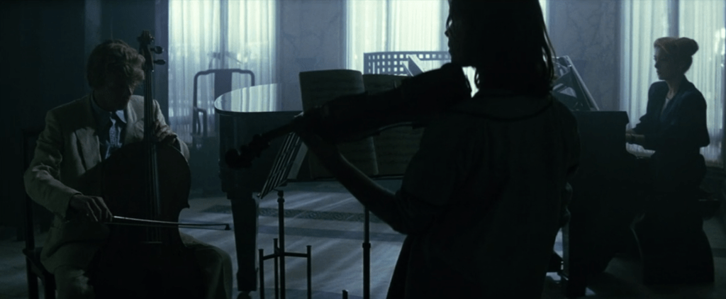 Miriam has been busy though. Meeting Sarah at a book signing, Miriam sparks on her, and Sarah’s glazed eyes betray how affected she is even by superficial contact with the vampire. Once mummy John has been boxed up out of sight, Sarah comes to Miriam’s house on the pretext of following up on John’s case. Sarah is busy and important and brilliant and also in a relationship with one of her fellow researchers, but she’s quickly enthralled–maybe too quickly. This part of the film, while beautiful and gorgeously frank, feels rushed to me, and if we were ever meant to idealize Miriam and Sarah’s romance, the speed of Sarah’s submission, going from small talk to sexytimes to bloodsucking in the same golden afternoon, doesn’t give space for it. It underlines Miriam as an opportunist, sitting back like a domme in a lounge chair to watch Sarah–ostensibly there as serious scientist lady–enthusiastically strip, and when Sarah joins her boyfriend for dinner later, his naked suspicion–and her unsubtle ogling of lady butts–seems a little fast-forwarded. Although that’s vampiric love for you. Forever and ever but also right now, because it is more like a spell than a relationship.