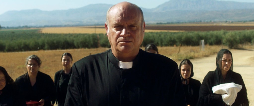 As Doña Matilde Cisneros (María Alfonsa Rosso) lies dying, her daughter Mercedes (Noemí Ruíz) sees death at the doña’s window. Mercedes laughs, claiming Death and their mother will fly away like witches. After Matilde dies, her daughters plan her wake, funeral service and burial. Well, Modesta (Natalia Roig) and Manuela (Virginia De Morata) do. Mercedes is not well and suffers from what appears to be a psychotic disorder. The sisters haven’t seen their brother, Eugenio (Pablo Puyol) in 16 years. But despite this estrangement, Eugenio drives to his family home in rural Andalucía. He tells his wife, Emilia (Virginia Muñoz), that he is there to bury his mother and sign some papers. He tells her that it will take a day and no more. Eugenio seems remarkably distant from Emilia. As they stop for gas and for Eugenio to make a call, Emilia discovers a shotgun in the trunk. Eugenio tells her it’s to protect a property, but it doesn’t feel like that. And while all grief is different, Eugenio radiates tension that seems about something other than seeing his family or burying his mother. Even the local priest, Don Andrés (Juanma Lara), is focused on something other than laying Matilde to rest and consoling her family.