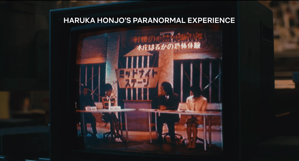 Enter Ju-On: Origins (2020), a limited series that purports to tell the “true” (wink) story of the cursed house, and we begin with what appears to be a genuine, linear beginning, with a paranormal researcher and an actress appearing together on a TV show in the 1980s, discussing a legendary spooky house, its reputation grim, but its exact location, or even its confirmed existence, unknown. Their interest seems to overlap; the actress, Haruka Honjo (Yuina Kuroshima), reports hearing ghostly running footsteps in their apartment at night ever since her boyfriend Tetsuya (Kai Inowaki) visited a mysterious house, and…paranormal researchers gonna paranormal research, right? Meanwhile, poor Tetsuya is concealing the fact that he can see ghosts…and that he saw ghosts. And that he is still seeing them.