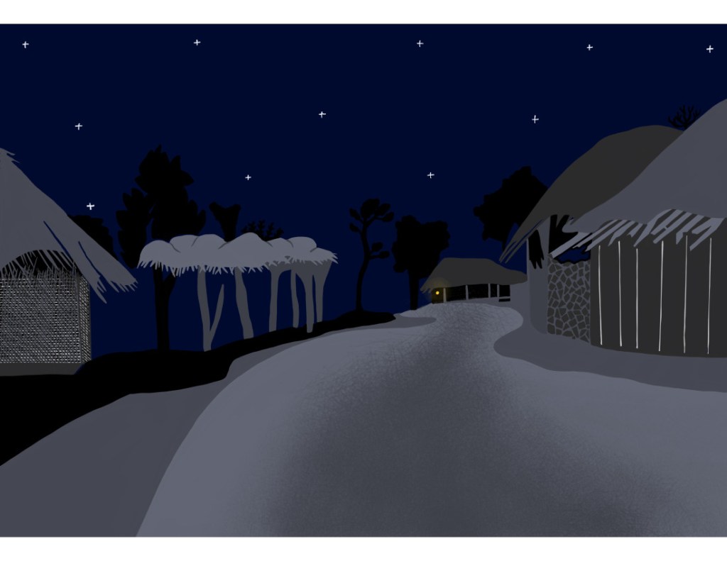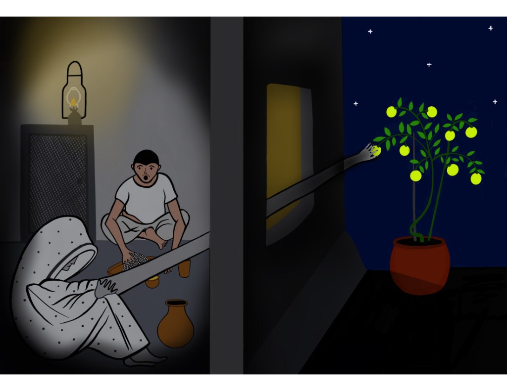 Gopal took the early afternoon train home. When he reached the station of his rural town, it was almost dusk. His home was a mile-long walk away. One thing that caught his attention was the eerie silence at the station. There would always be a few people sitting there, but this time it was completely empty, something he had never seen before. The little shanty around the corner that sold tea was closed, adding to the silence and creating a strange sense of unease, as if the whole village had fallen asleep. It was already night when he reached home. The house seemed unusually dark and quiet. Electricity had not reached his village yet, but there were always oil lamps outside the door. His mother opened the door. She had a small lamp in her hand, that hardly lit anything; he could barely see her. She seemed extremely reluctant to answer his questions, mostly replying in monosyllables. But she did inform him that the rest of the family wasn’t feeling too well, so they had all gone off to bed early. She was waiting to serve him his dinner, and she, too, would go to bed afterwards. He washed himself quickly and sat down to eat. Dinner was rice and dal (lentil soup). After a few bites, he realized that the dal was unusually bland. His mother was sitting by his side, waiting for him to finish his meal. He asked her if there was any lemon to flavour the dal. She nodded her head and stretched her arm to fetch the lemon. It stretched, stretched, stretched, and stretched … first it reached the window, opened it, then reached the lemon tree, plucked a lemon, and came back inside and gave it to him. End of story.