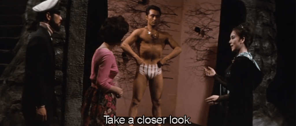 There is also queerness as the Black Lizard says, in the key of nonbinary, during her first escape from Akechi in musical form, it doesn’t matter whether she appears as a man or a woman because “there’s no me.” And the Black Lizard repeatedly confirms she is attracted to both Sanae and Akechi. And she has some feeling for her faithful Jun (Hiroshi Kawaguchi). But anyone the Black Lizard desires ends up in her museum, at least if she has her way. As in the novella, the Black Lizard is straightforward about her interest in Sanae, commenting on Sanae’s breasts and telling her, “I like jewelry but I also wanted you for your body.”
