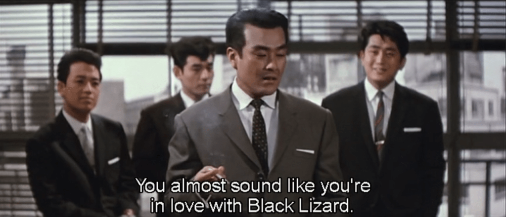 In the end, Black Lizard kills herself with a strong suggestion that death equals sex. But it’s also more complicated than that. She tells Akechi as he cradles her, “I didn’t do it because I got caught, but because you heard how I feel.”