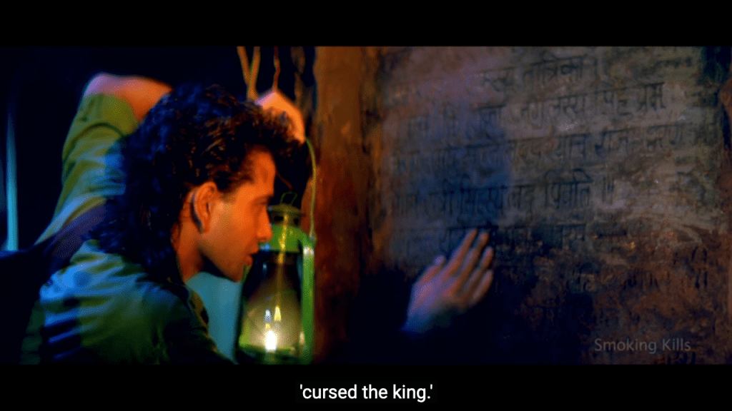 Determined to figure things out, Bhaskar seeks the help of another man who lives in the forest, Harry, who shares a centuries-old book that confirms the tale inscribed on the cave wall. If there’s one thing we know in 2021, it’s that if something is in print, it must be true, but we’ll have to stay tuned to find out if Bhaskar will learn this lesson as well. The best thing about Harry, a sort of kooky avuncular character, is that he is played by Hindi cinema’s best caucasian actor of all time, the American-Indian Tom Alter, who was born and raised in India and is known for his excellent spoken Hindi.