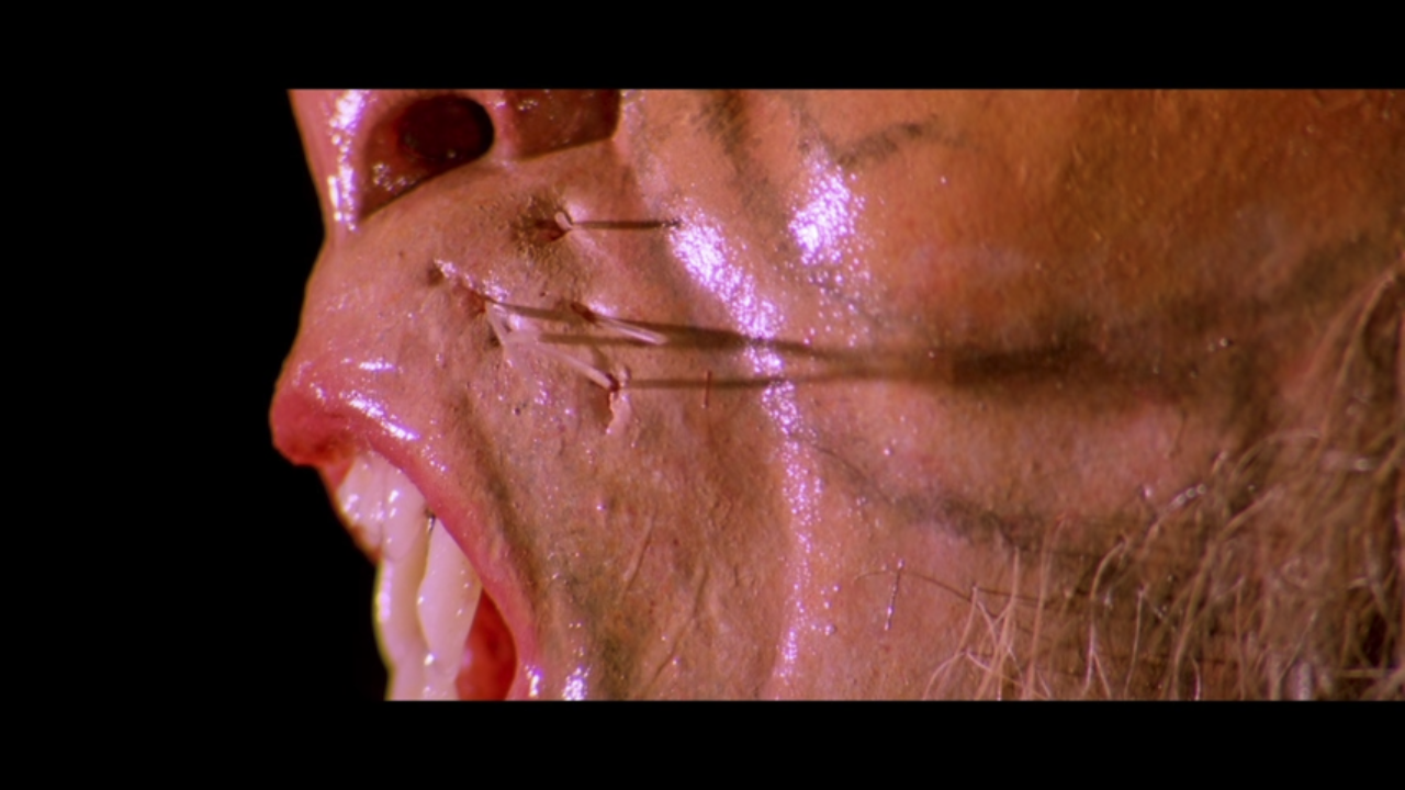 The next morning, the janitor finds the corpse by the pool, and we see bloody tiger paw prints leading to Vicky passed out on the floor. He wakes, examines himself in a mirror, and PICKS REMNANTS OF HUMAN OUT OF HIS TEETH! This is a gruesome touch that I absolutely love and that the actor relishes. Cackling, he says “Accursed man. This is your life. This will be your obsession!”