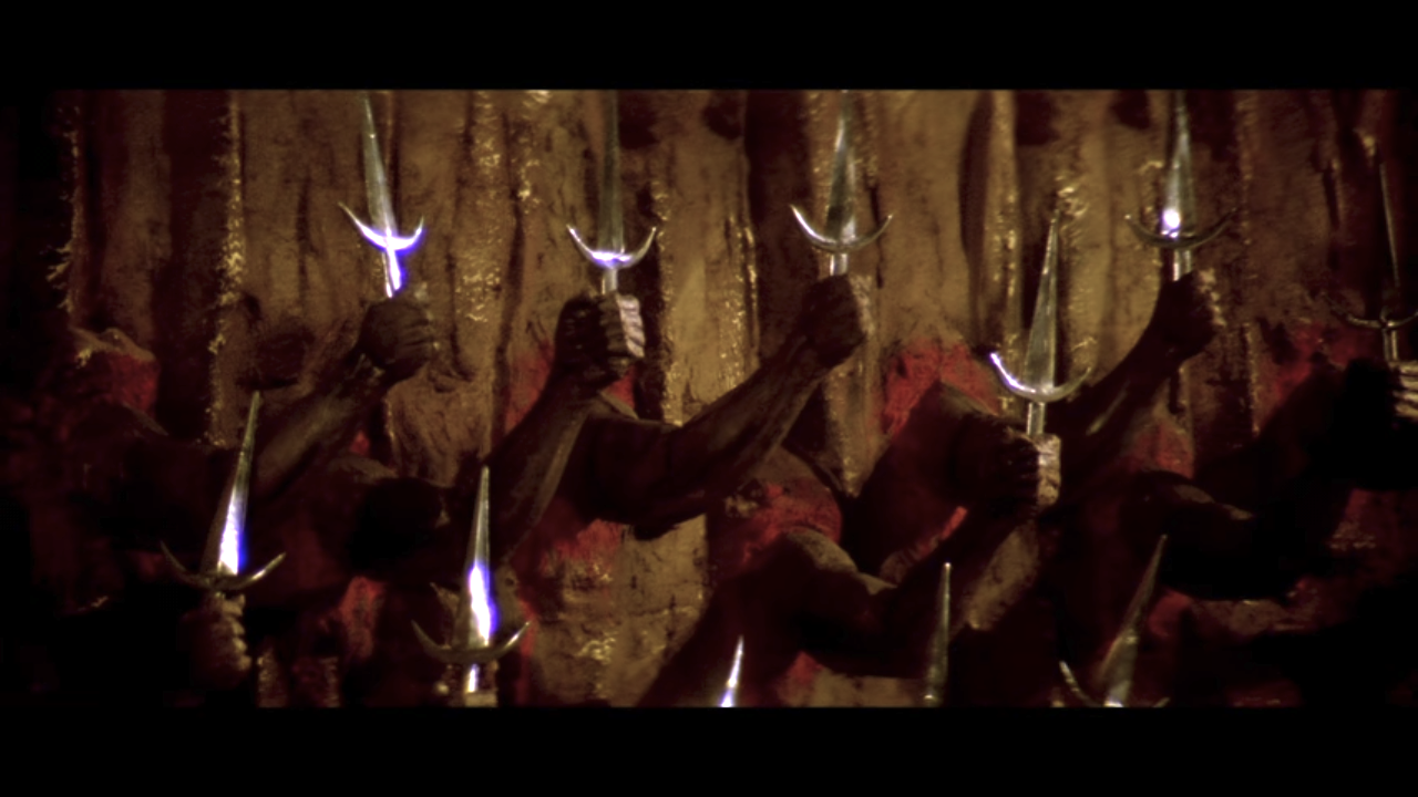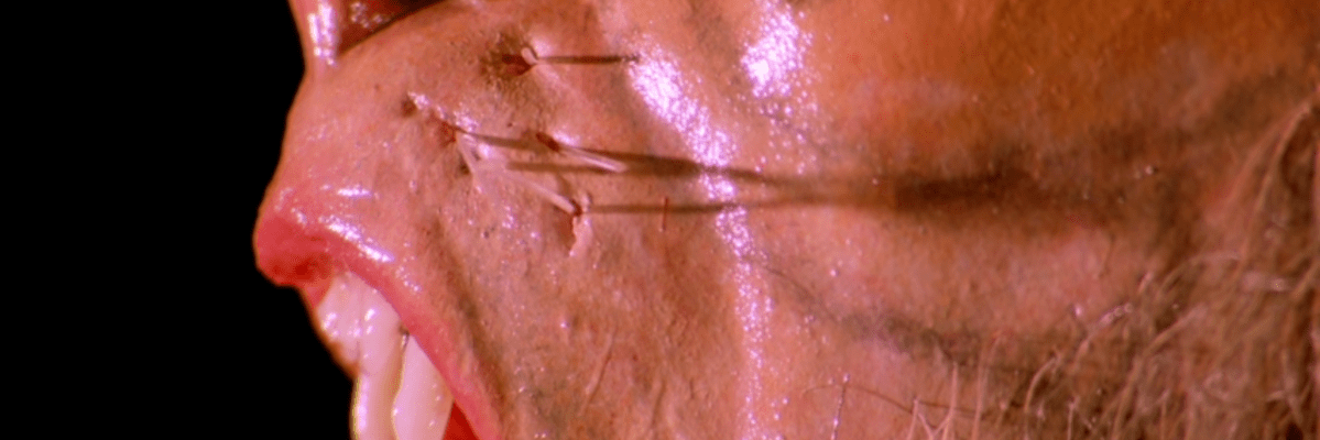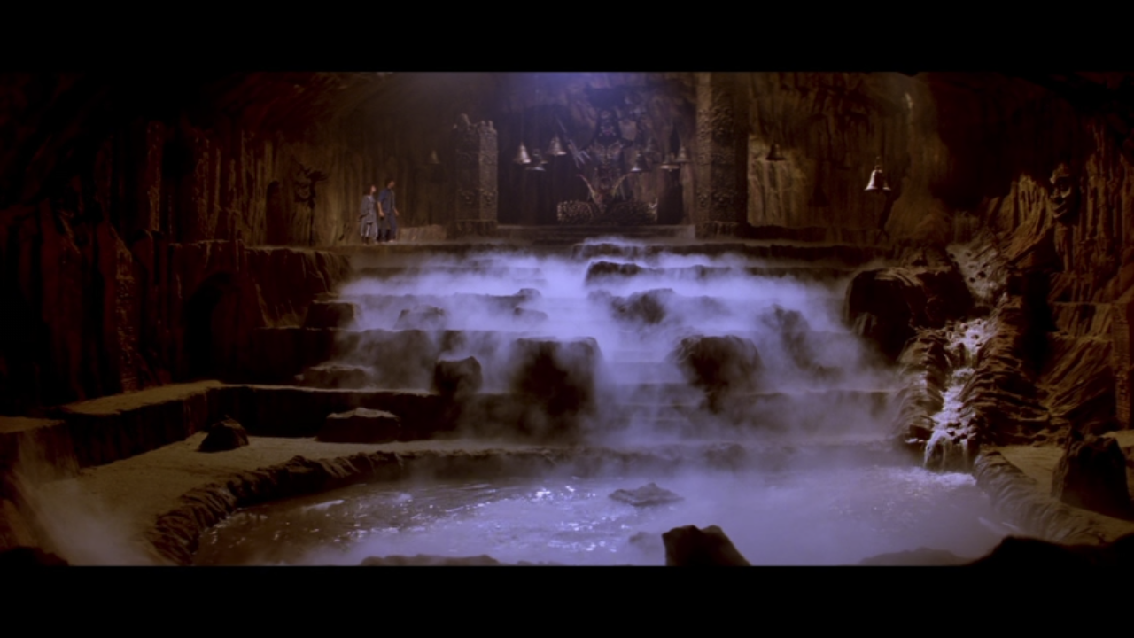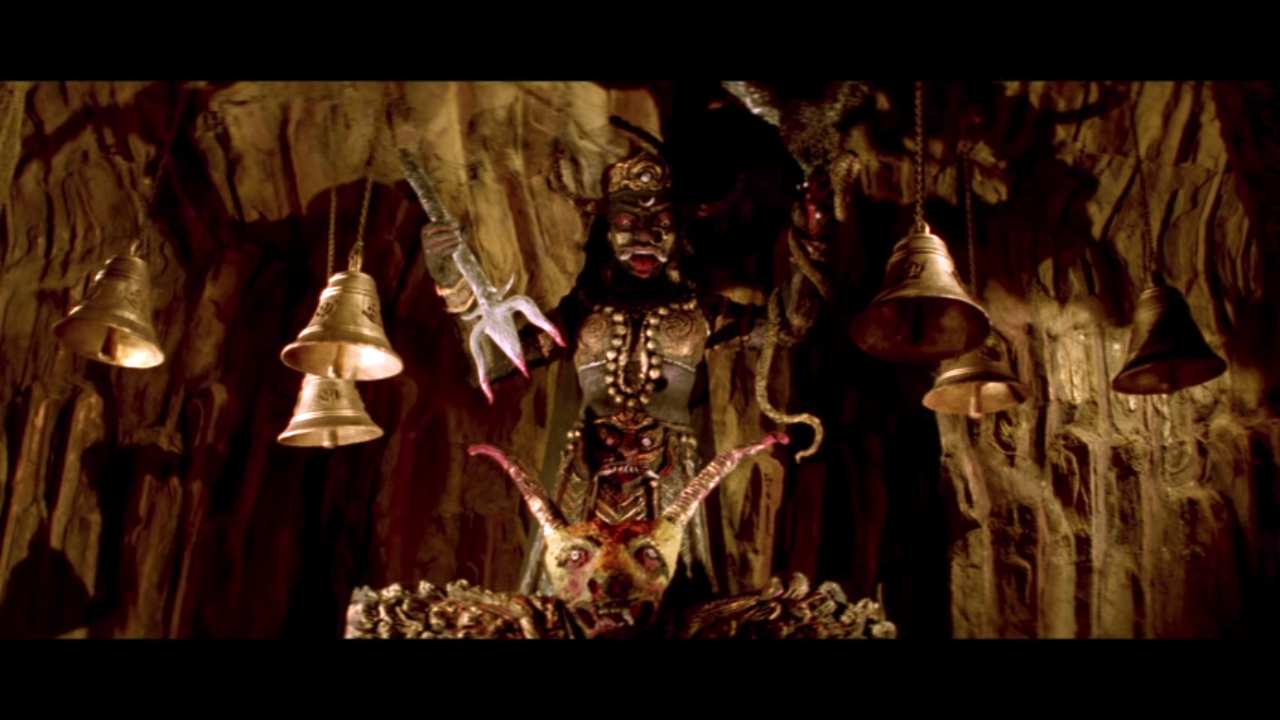 From here, the plot focuses only on the were-tiger’s attacks and all the other characters trying to catch him. I won’t tell you who is dispatched how and when, but I will tell you that the final sequence of the film hinges on special knowledge from Harry’s old book, a double-cross, and an ancient temple full of creepy carvings, a waterfall, and a wall covered in daggers. This temple set is really quite something, and I wish they’d found a way to spend more time in it.