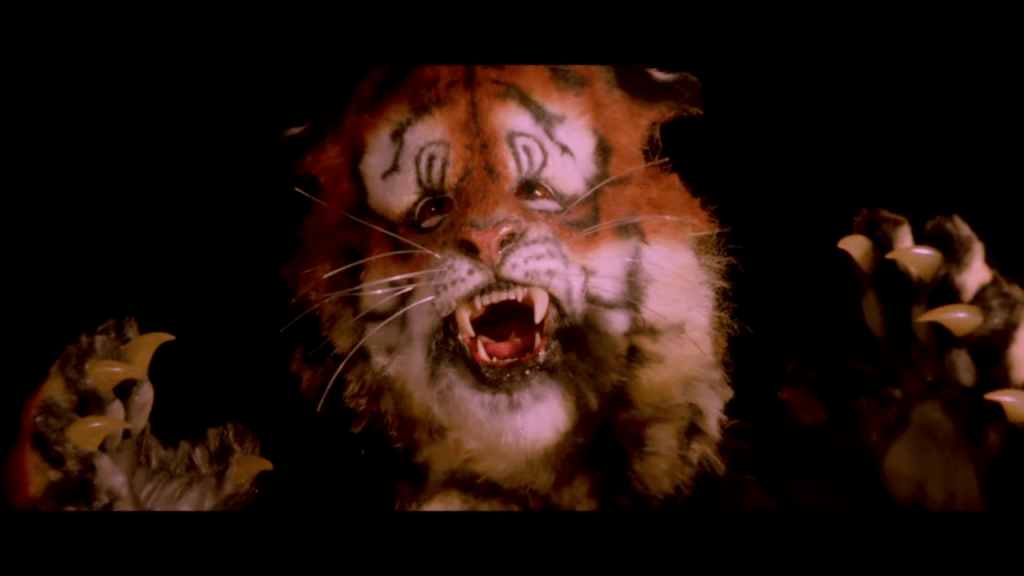 These are all revealed in close-ups, and I find it very effective…until the camera backs up to show his whole face, which looks very human-in-a-tiger-suit and more pitiably cuddly than fierce.