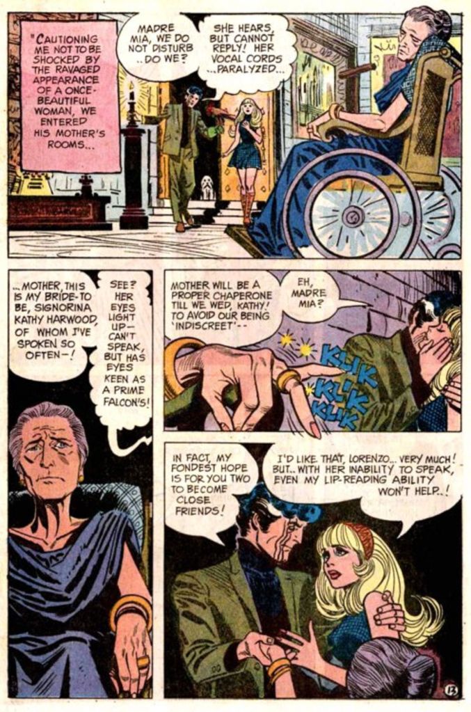 Frank Robbins, Alex Toth and Frank Giacoia’s “The Bride of the Falcon” feels like a giallo. While in Italian “giallo” refers to a crime thriller of basically any kind, it’s also become the name of a particular genre of Italian film that was coming into its own at the same time the ladies were investigating secrets in Sinister House of Secret Love. Gialli combines elements of thrillers, mysteries and horror. And gialli are often more concerned with atmosphere, sensibility and set pieces than realism. Big city magazine proofreader Kathy travels to the Castel di Falco on Isola Tranquillo near Venice to meet a pen pal, Count Lorenzo di Falco. It’s a contemporary comic and Kathy is thoroughly groovy, as groovy as Alex Toth can pencil and Grank Giacoia can ink. Kathy has been unable to hear since the death of her fiancé Jonny. But she finds love again through her correspondence with Lorenzo. Once again, no one wants to take her to Isola Tranquillo, but this time it is gondoliers who offer dire but non-specific warnings about Isola Trinquillo, Castel di Falco and the count. Why does it feel like a giallo? Because there is terrible facial scarring, falcon attacks, groovy 1970s lingerie, “hysterical” but temporary deafness, and police intervention. The secret revealed about Lorenzo’s partially paralyzed mother is extremely giallo. I shall reveal it now, so skip to the next paragraph if you don’t want to know: She is not his mother; she was his first wife the whole time!
