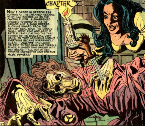 Issue two features one story, “To Wed the Devil.” It’s “a graphic novel of Gothic terror!” with art by Tony DeZuñiga and a story by Joe Orlando and Len Wein. Our protagonist, Sarah discovers a family servant, Agatha, standing in the middle of a pentagram in the manor’s basement. Agatha says she’s trying to ensure Sarah finds her one true love and she doesn’t think it is Justin Moore, the man Sarah wants to marry. In fact, Agatha seems to be team Baron Luthor DuMont, a man who glowers and strides everywhere while wearing a cape. The Baron is in love with Sarah and will save her father from financial ruin if she marries him. Guilted by her father and possibly intrigued by fashionable capes, Sarah accepts and travels to Bohemia by carriage. Beset by highwaymen, she is rescued by the grim Baronwho strides grimly into the fray in time to shoot the bandits with his matching and grim old timey pistols. Sarah, however, but only realizes who her rescuer is when she discovers him standing in the middle of a pentagram in his house! And he is obviously committed enough to his ancient magickal rites that his pentagram is a permanent feature of the room. Oh no! Sarah is tricked into wearing a black bridal gown and attending a Satanic marriage to the Baron. But Justin, along with religious family friends Father John and Uncle Samuel, intervene. John and Samuel hold a cross and a Star of David respectively to drive off the cult, but they don’t arrive in time to save Sarah’s cate, Tabeta.