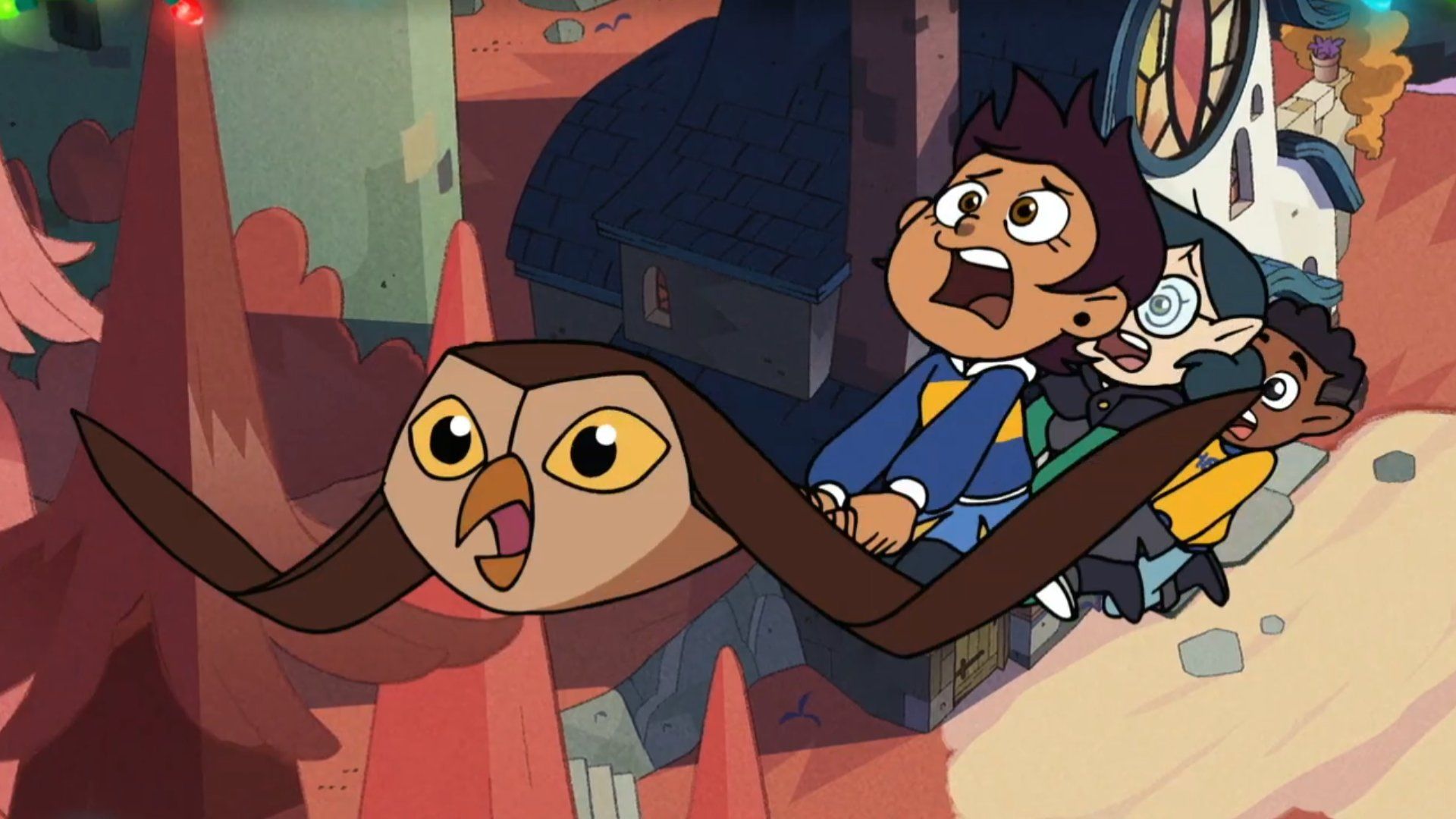 Luz Noceda’s mother is worried about how much time she spends reading the Good Witch Azura fantasy novel series and living in her imagination rather than learning what her mother sees as useful skills and making real-world friends. When Luz ends up in the principal’s office at school (again) for a book report that involves live snakes and rockets, her mother decides to send her away to Reality Check Summer Camp to learn to balance checkbooks and appreciate public radio. As Luz is waiting for the bus, a tiny owl steals her copy of Azura and she accidentally follows it through a magic door to a place in the Demon Realm called the Boiling Isles. The owl is the magical familiar of a rogue witch called Eda the Owl Lady, who lives with her adopted demon son/pet/sidekick King, an adorable little guy who looks a bit like a fox with a horned dog skull for a head. They live in The Owl House, which is actually itself a house demon called Hooty. Luz becomes Eda’s apprentice, makes friends with witch-kids Willow and Gus, and spends the summer learning how to do magic as a human instead of crunching numbers at camp boring.