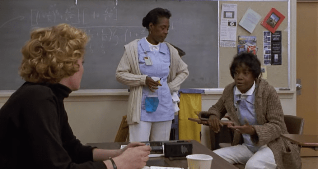 The film follows Helen Lyle, a semiotics graduate student in Chicago, as she pursues her thesis on urban legends into places less privilege-armored people fear to tread. The urban legends topic also happens to feature in a lecture course, given by her professor husband Trevor (Xander Berkley), a source of early friction in the film when Helen accuses Trevor of falling back on his promise to change his curriculum while she and Bernadette are interviewing the freshmen for their thesis. This conflict is one of many points where Helen’s thesis drama strikes me as unrealistic, up to and including her being unfamiliar with Purcell’s research on the Candyman legend, which makes for a decent exposition on-ramp, but also makes Helen (and Bernadette) look hasty and lazy. Purcell’s paper isn’t even ten years old. You might not even have to go through the microfiche, ladies. Come on.