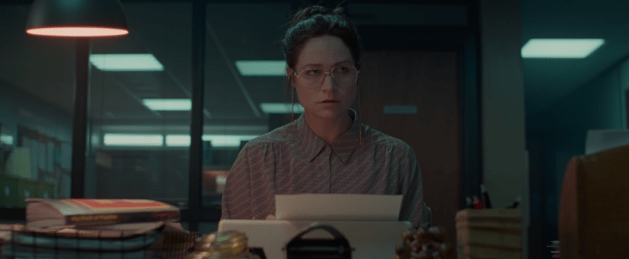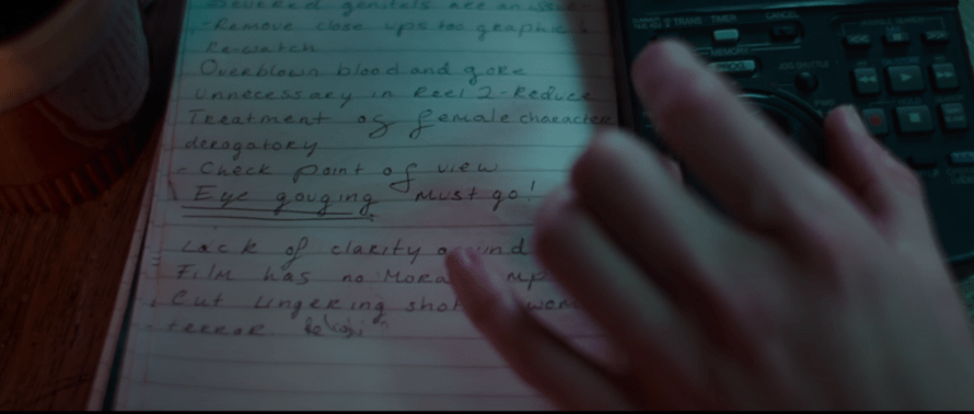 If this were another film, I might warn you of spoilers. Censor is a little impervious to spoilers though, as so much remains intentionally–indeed explicitly–ambiguous. Which is not to say you can’t make clear inferences assembling the parts. Amnesiac Killer, you say? Enid was the last one to see her sister? Her job is literally editing out the gory parts? Don’t Go in the Church–a reissue of an older film, mind–recalls almost exactly what Enid does remember about Nina’s disappearance, up to the murder? And now they’re filming a sequel with an actress who is a ringer for Enid’s sister as an adult? What a poetic sequence of unrelated facts! And just to double underline the point, when Enid’s coworker tries to comfort her about the Amnesiac Killer scandal, he draws on his background in psychology to speculate why the murderer can’t recall his horrific crimes. “You’d be surprised what the human brain can edit out when it can’t handle the truth.”