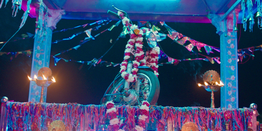 Dug Dug leans into visual design, cinematography, music, sound and set pieces to tell its story. There are characters, but Dug Dug is not a strongly character-driven film. And I am fine with that. I loved the use of light and use of color, the creeping pink and blue in the arid Rajasthan landscape. I loved the devotional art created for the film. And I’m pretty sure there’s a musical reference to Satyajit Ray’s fantasy adventure comedy, Goopy Gyne Bhagha Byne (1969), but it’s been a while since I have watched that. While I understood the criticisms of religious movements in the film, I also can’t help enjoying this new religious movement. I see the faulty basis, but I just love that motorcycle and the devotional paintings.