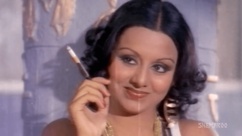 While searching Mike’s hotel, the police come across Ratan and remember that he’s still a likely candidate for Momba’s murder a few weeks ago. Mogambo finds out and calls Mike at the police station, insisting that Ratan must not be detained. From an inner sanctum emerges a man with a cane…Ajit, who turns out to be the police commissioner! And Ratan…turns out to be working for the police!!! I was genuinely surprised by this, even though I shouldn’t have been, given how the concept of film heroes usually works in this era. The casting of Vinod Khanna in this role was clever, because he was known for playing villains early in his career; his switch to being a hero had occurred by the time Maha Badmaash released, but I suspect the makers were counting on audiences to remember his earlier work when watching the first 90 minutes of this film. What also surprised me is that this conversation happened in a room with only saloon-style knee-to-shoulder-height swinging doors between it and the area where Mike was waiting, so surely he heard this whole exchange?!?